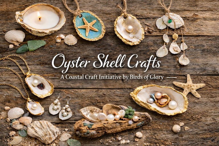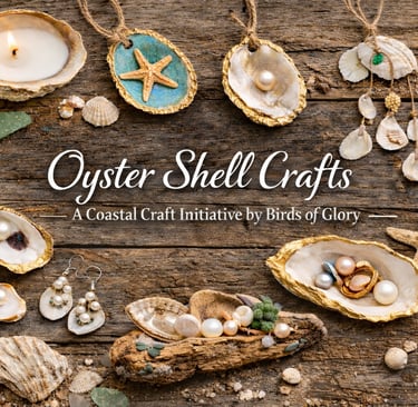 Birds of Glory encourages creative reuse of oyster shells as a way to promote sustainability, community engagement, and hands‑on craftsmanship. Oyster shells can be transformed into beautiful home décor, jewelry, holiday ornaments, and garden art. These projects are easy to learn and can be enjoyed by individuals, families, and youth groups.